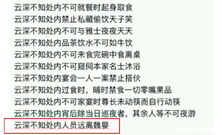 关于姑苏蓝氏的家规,像不可疾行,不可私自斗殴,不可大声喧哗,这些还算比较正常的。不过里面有一些,真的很奇怪。如果要数数他们家最奇怪的两条家规,应该就是“远离魏婴”和“饭不可过三碗”。