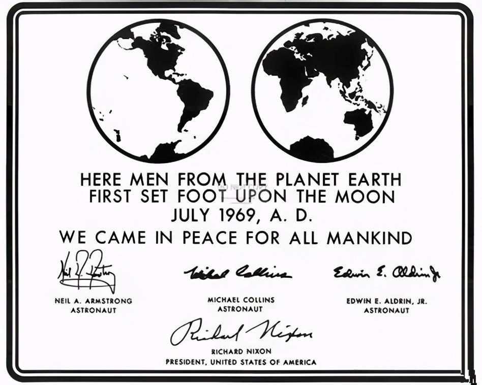 他们总共在月球表面行走了1公里的距离,距离登月舱最远60米,并收集了总重21.55公斤的月球样本。宇航员还将一块纪念牌安置在登月舱下降级的爬梯上。纪念牌上画有2幅地球的图像(东半球和西半球)、宇航员和尼克松的签名。纪念牌上镌刻着:公元1969年7月,来自地球的人类第一次登上月球,我们为全人类的和平而来。