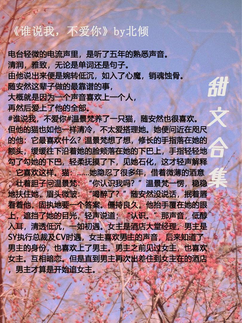 #谁说我,不爱你#温景梵养了一只猫,随安然也很喜欢。但他的猫也如他一样清冷,不太爱搭理她。她便问近在咫尺的他:它最喜欢什么?温景梵想了想,修长的手指落在她的额头,缓缓往下沿着她的脸颊落在她的下巴上,手指轻轻地勾了勾她的下巴,轻柔抚摸了下,见她石化,这才轻声解释:它喜欢这样。猫:……她隐忍了很多年,借着微薄的酒意,壮着胆子问温景梵:“你认识我吗?”温景梵一愣,稳稳地扶住她,眉头微皱:“喝醉了?”随安然没说话,抿着唇看着他,固执地要一个答案。僵持良久,他抬手覆在她的眼上,遮挡了她的目光,轻声说道:“认识。”那声音,低醇入耳,清透低沉,一如初遇。