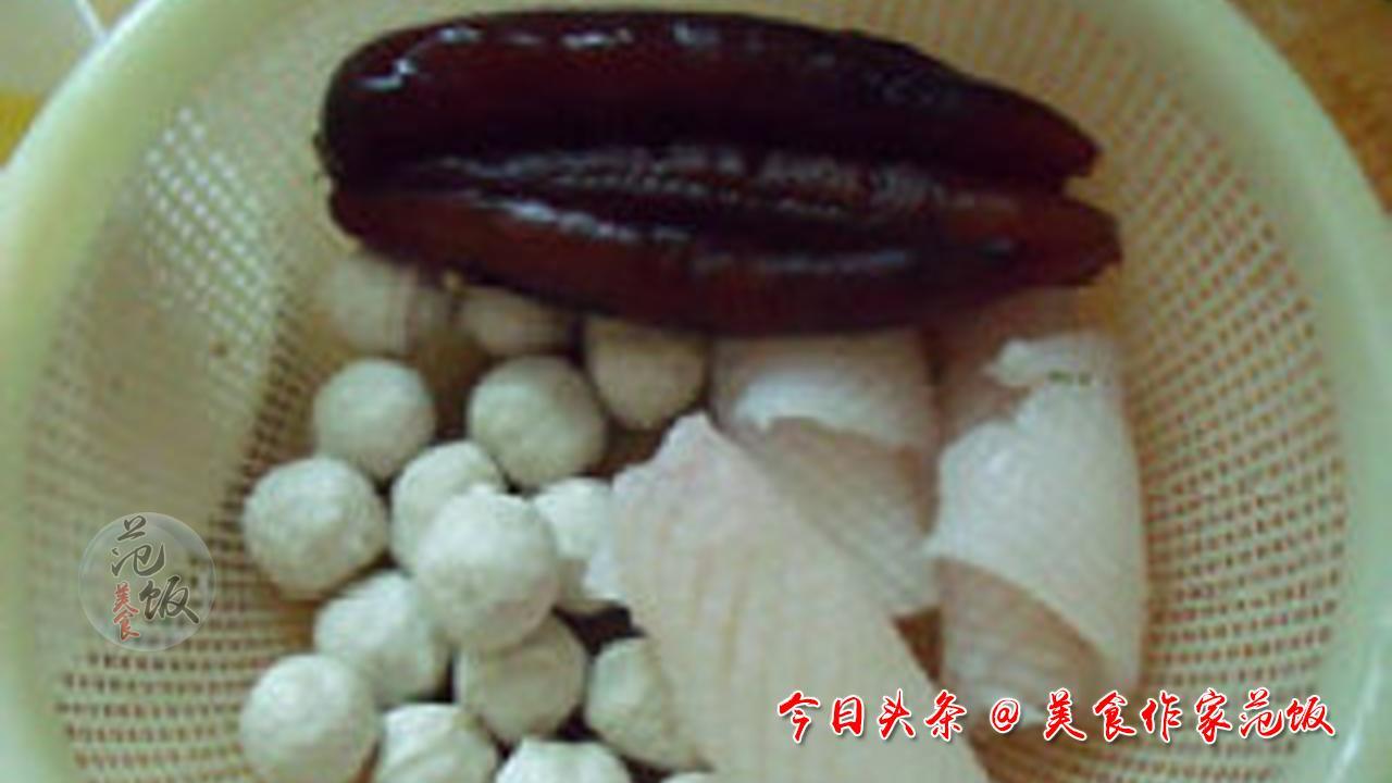 3、把鱼丸海参鱿鱼姜丝葱花,一起下水煮开。