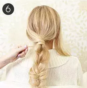 STEP6:将左右两侧预留的头发缠绕着发辫发根的橡皮筋,用发卡将缠绕的发尾固定。