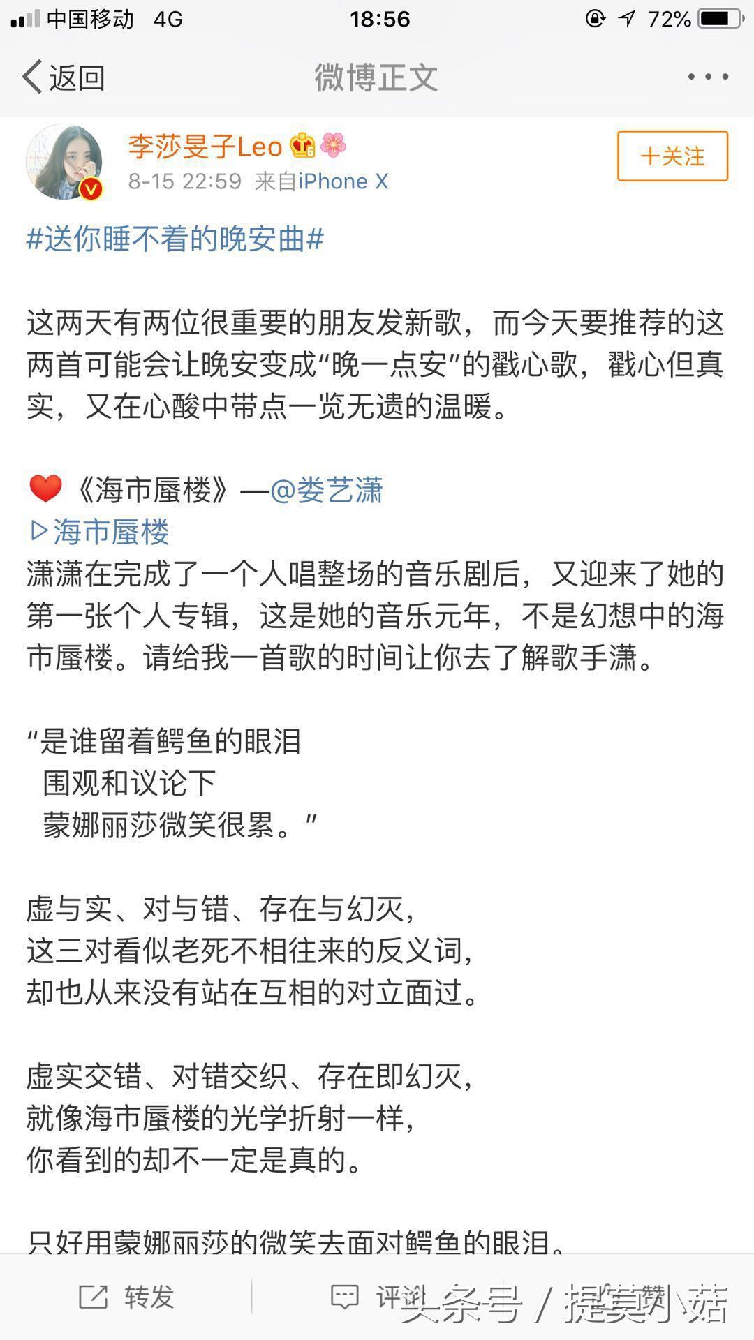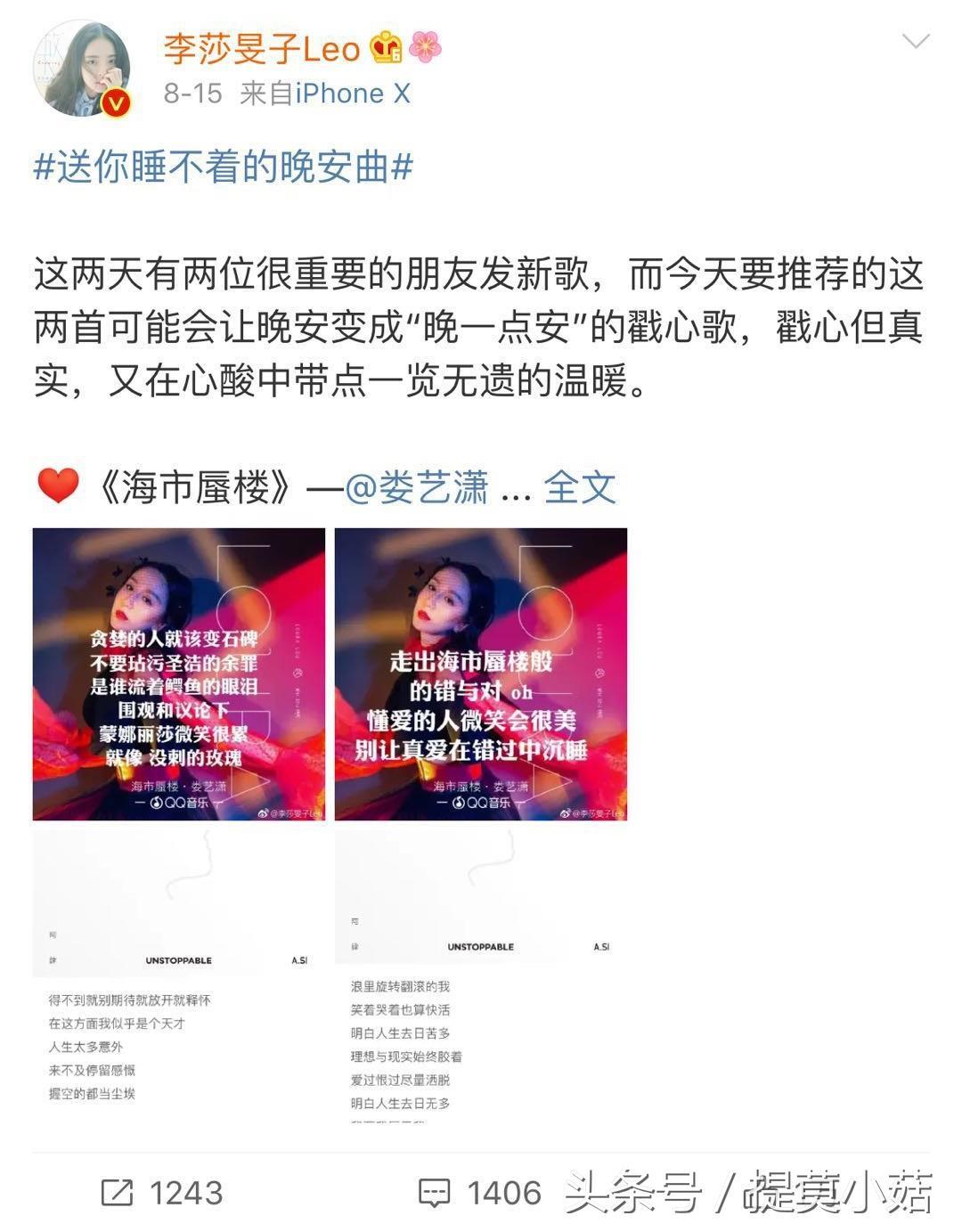 娄艺潇最近发行新专辑,李莎旻子还特意发微博嘱咐大家记得去听歌。