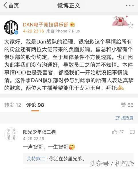 今天晚上,两位大主播pdd和小智开直播就DAN战队进行了激烈的争论,期间火药味十足,真是伤了不少的和气。但就在29日23点16,DAN战队经理出来发声,对此事进行了解释,其实蛋总和小智是有俱乐部约定的。但是不久该微博又被删除。下面小编通过几张图带大家回顾一下此事的始末。