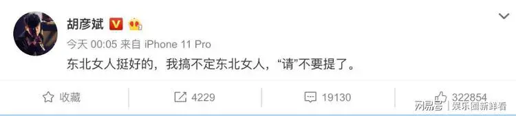 胡彦斌得知此事后则发微博痛斥郑爽,说她不断拿前任出来开涮,动不动就要提起自己,还要按照套路和营销号一起给他扣帽子,胡彦斌说“这锅我不背”,还专门发一条微博回应“我也搞不定东北女人,请不要再提了”。这一大胆的举动却是引起了很多女方粉丝的不满,他的这条微博下面几乎被女方粉丝占领,自然是骂声一片。
