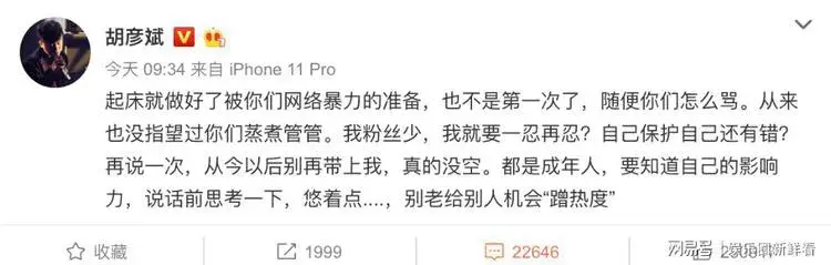 其实,瓜瓜认为,胡彦斌生气也不是没原因,他本人就是一个喜欢直来直去的人,当初能直接表达对郑爽写书的支持,现在就也能直接表达对郑爽言行举止的不满。他的愤怒点在于女方粉丝的网络暴力和郑爽不加思考的言行。的确如此,既然已经分手,彼此又都是公众人物,明知自己的言行会有很大影响,郑爽却还是屡屡提起胡彦斌,这样的情商不得不说可能是有点低了,还希望爽妹子之后能够话前三思。