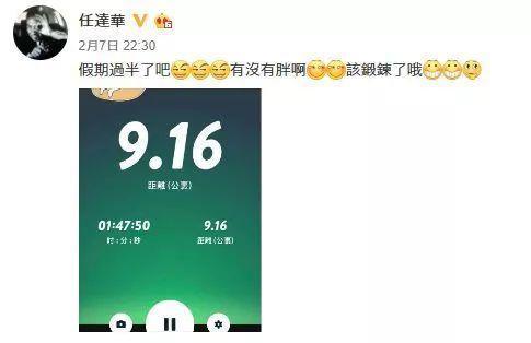 2019年2月7日,同样是大年初三,任达华又晒出自己的跑步记录:9.16公里,并配文:假期过半了吧,有没有胖啊,该锻炼了哦。