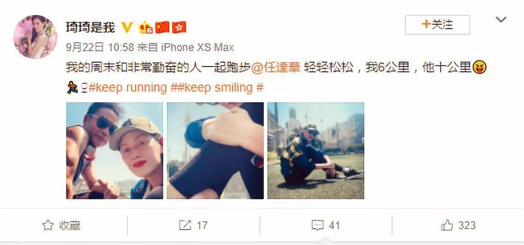2019年9月22日,遇刺后两个月,超模琦琦在微博上晒出和老公任达华跑步的照片。琦琦发文称:“和非常勤奋的人一起跑步,我6公里,他10公里”