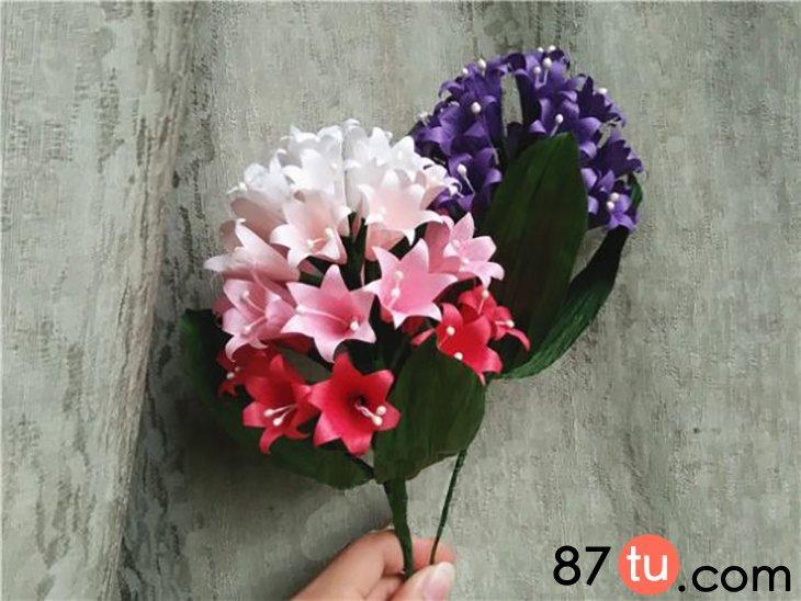 这款风信子和很多人知道的风信子做法有所不同,以前我们就是把一张制作好的花瓣用铁丝一瓣一瓣串起来就好了,今天做的这款风信子教程则是把一片片花瓣组合成一朵,再由这一朵朵组合成一支风信子,这个做法更接近真实的风信子。