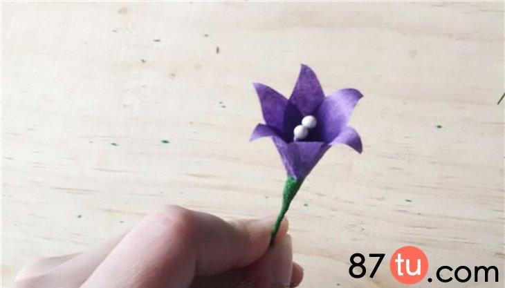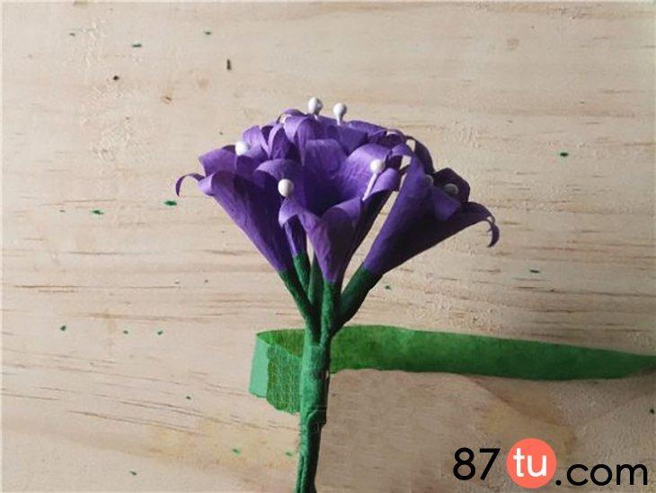 将花蕊放入做好的花朵之中,底端用绿胶带缠好,粘性好的绿胶带很容易就缠住了,粘性不好的胶带,可能会比较困难喔。