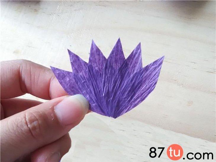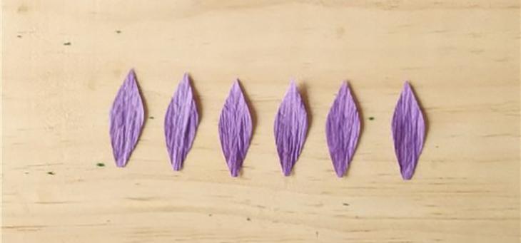 再将花瓣粘成一个圈之前,先用剪刀将花瓣顶端部分刮弯,这样方便些,几片可以一起刮,速度快,效果也好。如果是先粘成一个圈,再刮花瓣,这样不好操作,还得一片一片的刮,花时间。