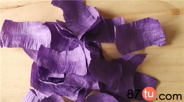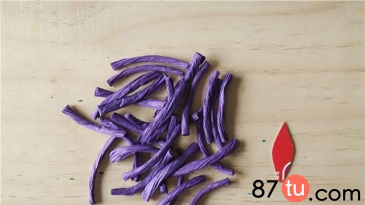 将纸藤剪成一段一段的,展开的速度要快些,但是不足之处是展开后的纸藤边缘是不平整的,所以,建议大家先把纸藤展开后再开始剪花瓣。
