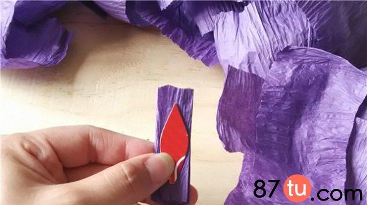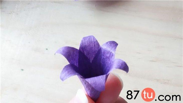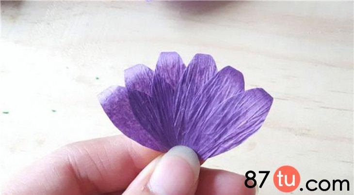 再最后一片花瓣的边缘出抹上胶水,与第一片花瓣围拢起来,第一片花瓣要粘在第6片花瓣上面,使整个花朵都是一片压着另一片的形状,花朵的底端不要粘的太死,要留些空隙,后面要放有花蕊的铁丝,空隙也不要太大,太大的话,花蕊跟花朵用绿胶带固定不住。