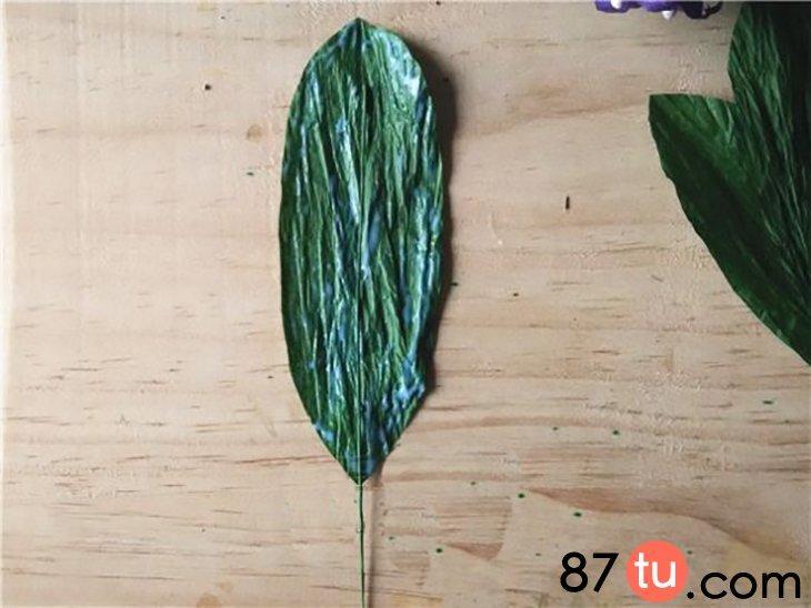 如图,在一片叶子上抹上白乳胶,将26号绿铁丝放在上面,再将另一片覆盖在上面,一片叶子就做好了。将剩下的两片叶子做好,做好后把3片叶子用绿胶带粘在风信子下面,缠好一片叶子后,再缠第二片叶子,最后是第三片,3片叶子差不多是在一层下上。