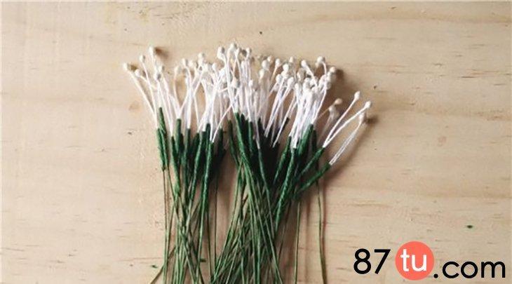 将花蕊对折,用铁丝钩住,用钳子将弯下来的铁丝夹紧,然后用绿胶带在花蕊下方缠一下,更好的将花蕊固定在铁丝上。