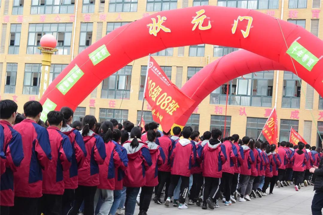上午8时30分,百日冲刺誓师大会暨成人礼进行第一项,长葛一高高三年级全体学生跑步穿过“成人门”。