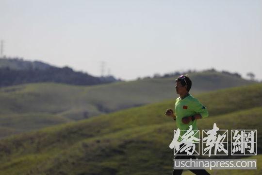 白斌在洛杉矶的公路上奔跑。侨报记者邱晨摄