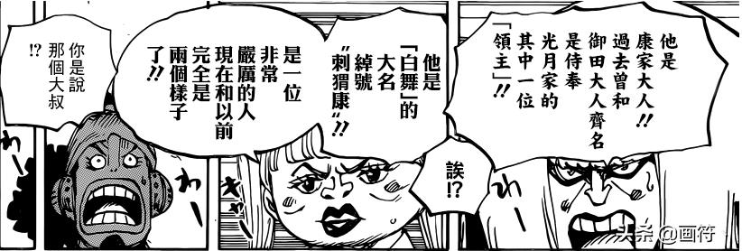 小忍和堪十郎认出了多康,多康,是康家大人,基本上全国皆知,曾经和光月御田齐名,还是一地大名,他的处境和花豹五郎一样,如今的形象和当初的形象,根本是两个样子。在这一话里,明显可以看出,民众很爱戴康家大人。果然又是一个花豹五郎,开头不起眼,结果摇身一变就成大佬了。