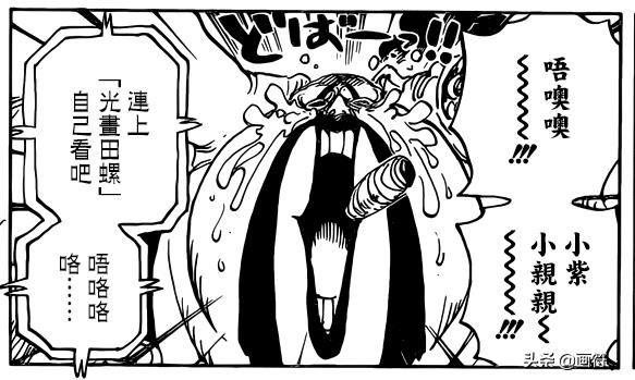在现实世界里,小紫已经死(假死)了两个多月了,但是在海贼王里,小紫才是死一天,所以大蛇还没从悲痛中走出来,因为大蛇还是很喜欢小紫的,要是大蛇得知自己被小紫和狂四郎耍了,不知道会是什么表情……同样痛心不已的还有奎因,作为小紫的爱慕者,在得知小紫死亡的消息后,满眼是泪