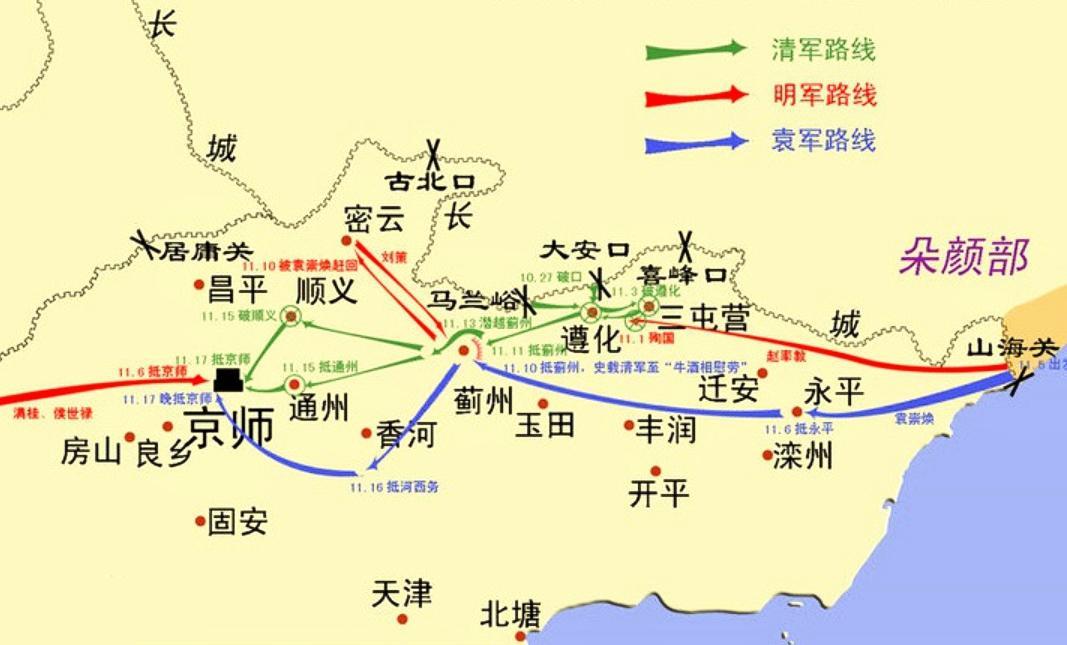 但他的运气还不错。就在贬官的第二年,皇太极率军由龙井关、洪山口、大安口入塞,攻占遵化,直逼京师。