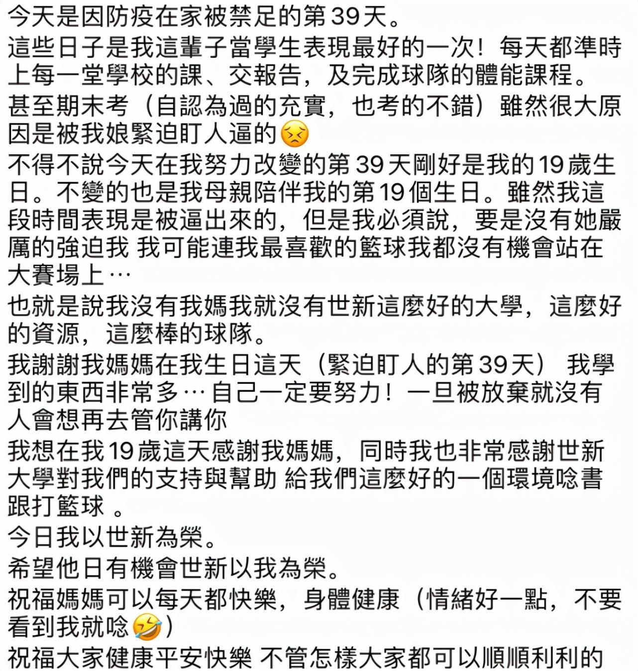 对邱黎宽的付出,邱煌祎感恩在心,他曾在19岁生日那年写下了长文,其中提到最多的就是感谢邱黎宽。