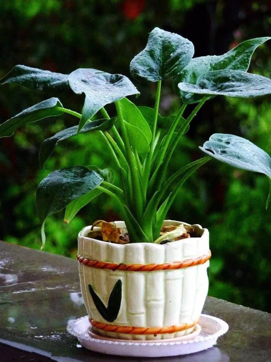 滴水观音别名滴水莲、佛手莲,是天南星科海芋属多年生草本植物,有药用价值;在温暖潮湿、土壤水分充足的条件下,便会从叶尖端或叶边缘向下滴水;而且开的花像观音,因此称为滴水观音。形象似观音之手。滴水观音是热带雨林的林下植物,故其生长需要高湿度,散射光才好。