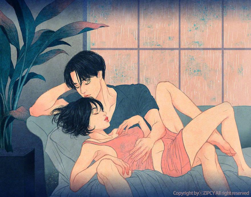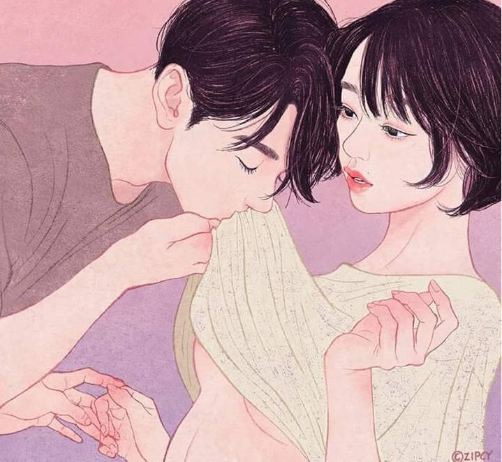 Zipcy的画,似乎总能捕捉到恋人对彼此最细腻的碰触。 虽然画中的男女有时候「衣冠不整」,但并不让人觉得低俗,而是渗透著恋人们在日常相处中点点滴滴的惬意和温暖