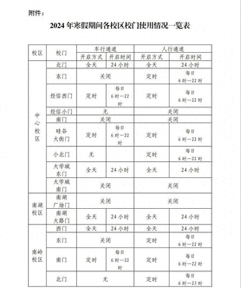根据学校《关于2024年元旦和寒假放假的通知》工作要求,结合校区假期工作实际,现将寒假期间各校区校门使用情况通知如下: