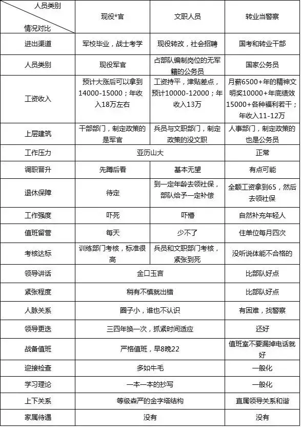 2018年军队转业已经到来,何去何从,最近网络上流传比较广泛的转业当警察和转文职的区别对比尤为火热: