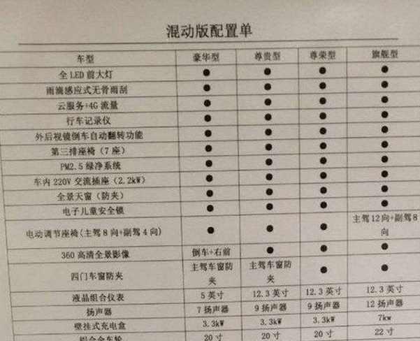 唐二代混动版配置图现在已经流出,从配置单上我们可以看出来,混动版唐的配置可以说相当不错,全系标配全景天窗、PM2.5绿净系统、云4G服务以及全景影像等主流配置,全新二代唐起售价将会延续现款车型售价,起售价极有可能在26万左右,补贴之后终端价在20万左右。