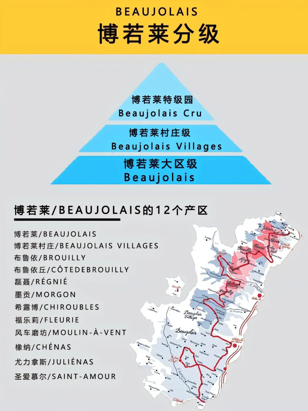 博若莱产区的葡萄酒共有三个等级,由低到高排列分别为: