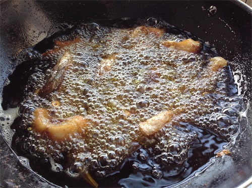 3. 把适量食用油加入铁锅中,放至灶上用中火加温至八至九分热,再放入鱼块(注意防止热油溅出伤人),用中火把鱼块炸至表面微黄,再转小火,炸至表面金黄(其中需多次转动铁锅,防止鱼块粘锅和鱼块互相粘连)。