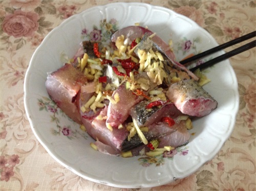 2. 在已加入草鱼块的容器内,撒上适量的盐、少许胡椒粉、混合适量生抽、生姜丝,干辣椒段,料酒,(根据喜好也可加白糖),搅拌均匀后,腌制二小时左右,其中均匀翻动多次。