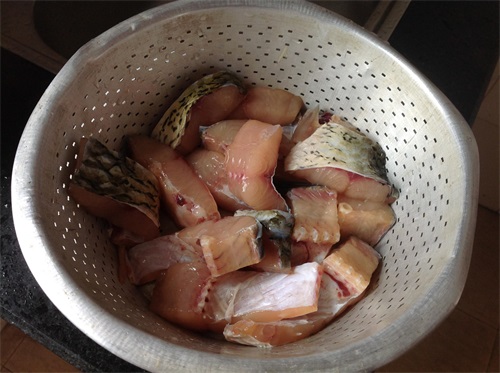 3. 把腌制好的草鱼块捡出,去除上面的配料,稍微用清水冲洗一下(注意不可用水冲洗太久),再用漏筛晾干水分备用。