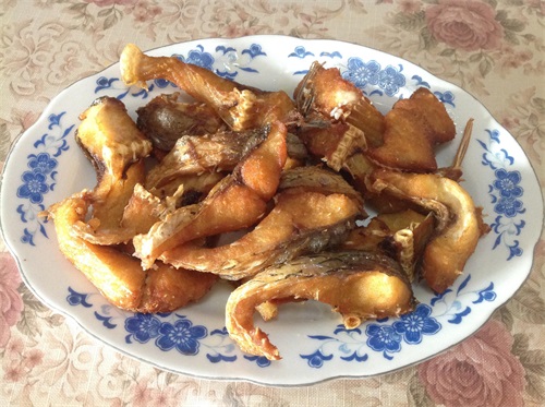4.把油锅中已炸至金黄色的草鱼块,用漏勺捞出装盘(注意保持草鱼块的完整),至此,香喷喷的"油炸草鱼块"制作完成,即可趁热食用,外酥里嫩,老少咸宜……