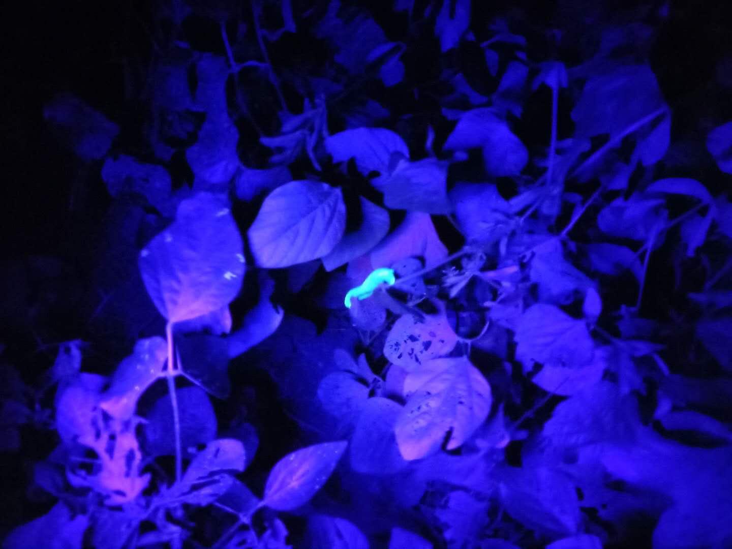 捉豆青虫,要在晚上捉,豆青虫本身就是青色的跟豆叶的颜色一样,白天不容易发现。晚上的时候,有一种专门捉豆青虫用的灯,打在豆青虫身上豆青虫会发光,这样很容易就找到了。