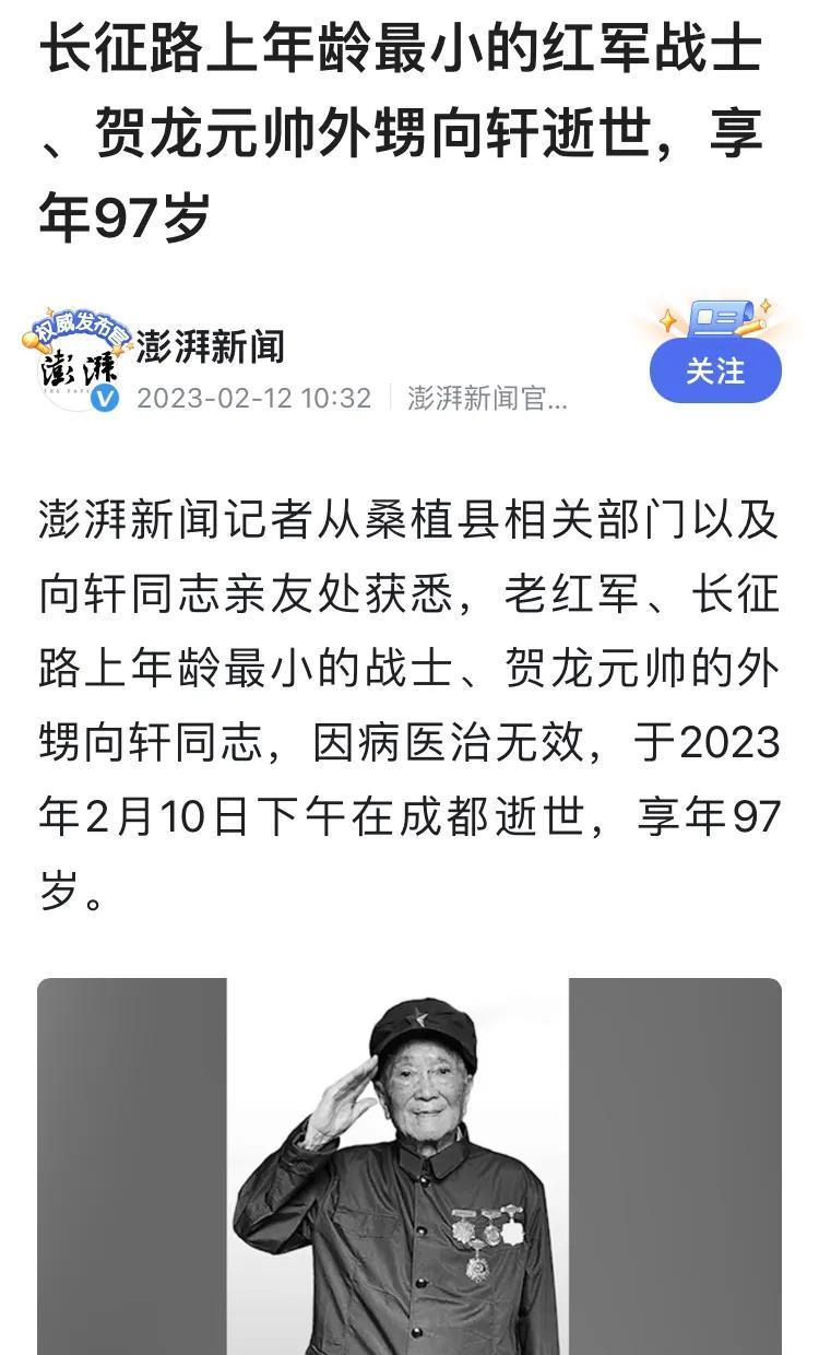 向轩是贺龙元帅的亲的外甥,贺龙是向轩的大舅。向轩出生于1926年3月,7岁参军,9岁参加长征,属于长征中年龄最小的红军战士。