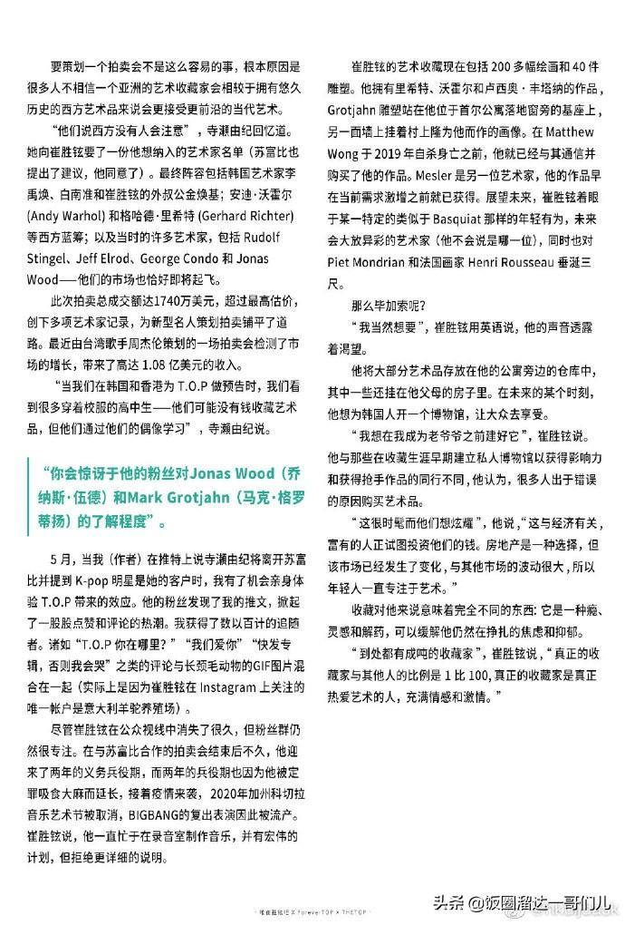 本次采访主要围绕艺术家、艺术品、收藏家、拍卖会等与收藏相关的内容,但也提到BIGBANG的回归计划。因为新冠疫情来袭,2020年科切拉音乐节被取消,BIGBANG的回归计划被迫中断,感到不开心。TOP一直忙于在录音室制作音乐,并且有远大的计划,但拒绝透露详情。