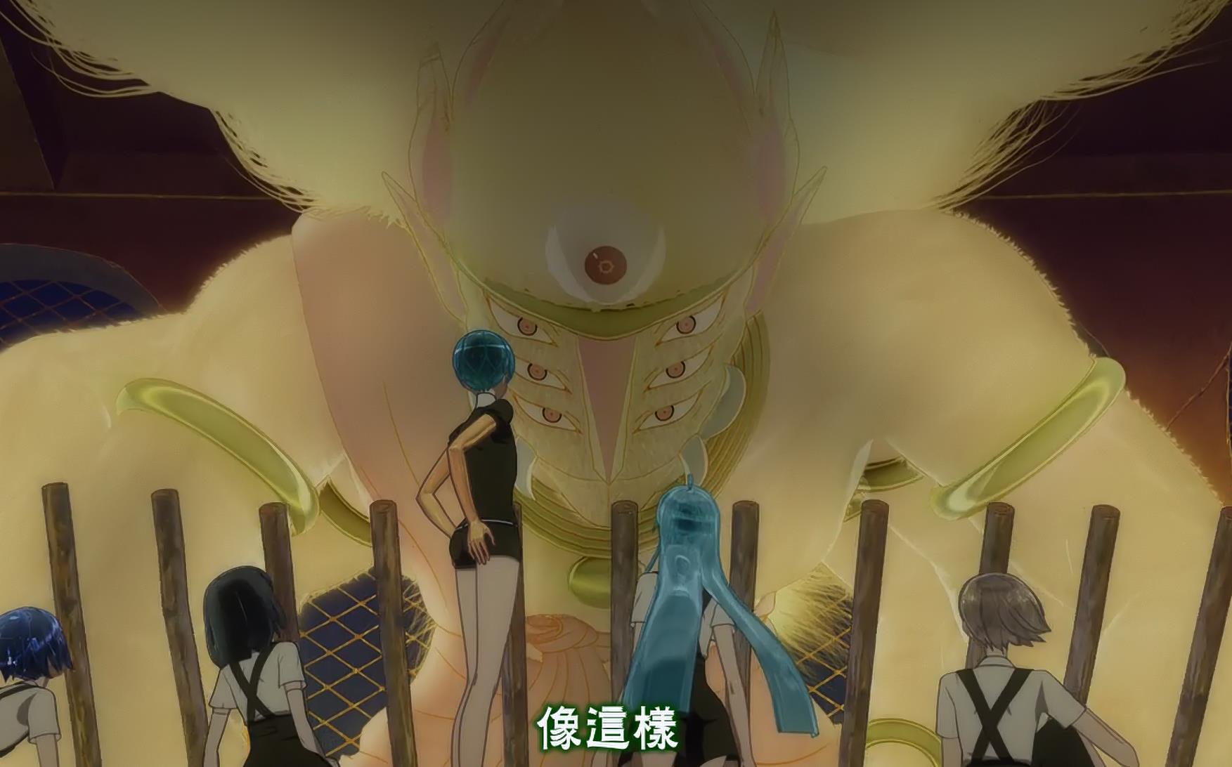 持续上一集的剧情,磷叶石和袭来的新型月人交战,而此时交代了变石拥有看到月人就会召唤出第二人格的奇异特性