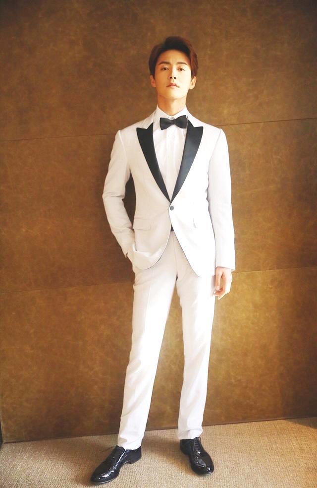 一身白色西装霸道总裁范儿立显,黑色的领结,外套的翻领和脚上的黑色皮鞋遥相呼应,干净整洁,大方俊朗,率性洒脱。