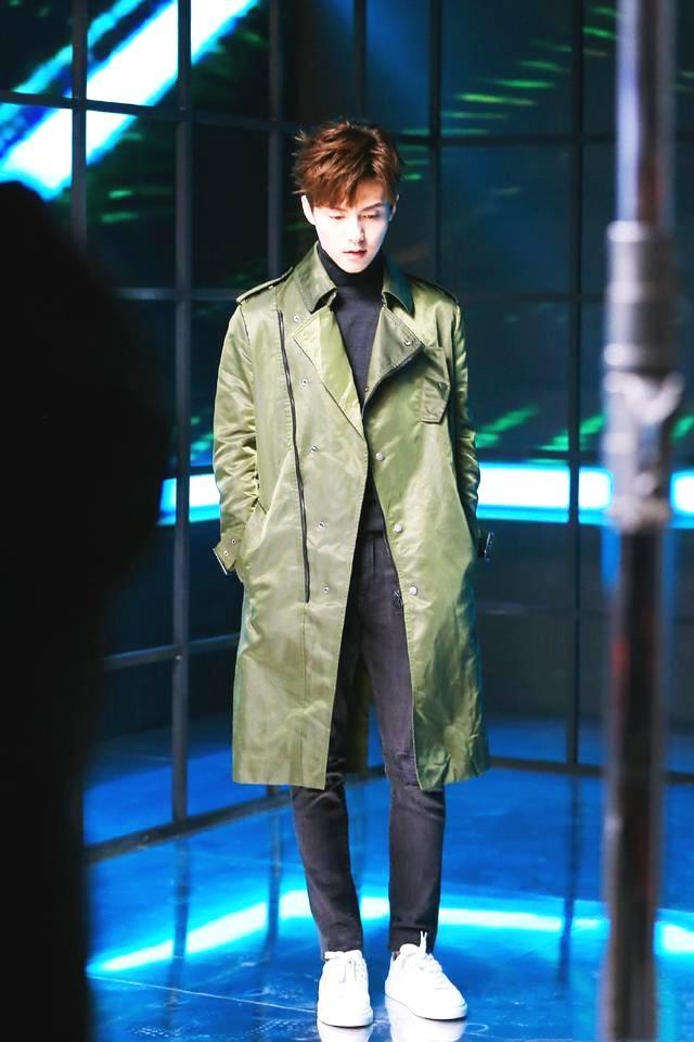 军绿色大衣搭配休闲裤小白鞋,简约时尚,星范儿十足,低头沉思仍然遮掩不住扑面而来的帅气,双手插兜,却丝毫没有逼人的气势,有的只是点点温柔,让人倾心。