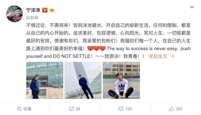 宁泽涛宣布告别泳坛,他在微博中写道“不惧过往,不畏将来!告别泳池碧水,开启自己的崭新生活。任何的限制,都是从自己的内心开始的。追求美好,包容遗憾,心向阳光,笑对人生,一切就都是最好的安排。感谢有你们,我亲爱的包粉们!祝福你们每一个人,在自己的人生路上遇到你们最美好的幸福!♥♥♥ The way to success is never easy, push yourself and DO NOT SETTLE!~~致游泳!致青春!!”