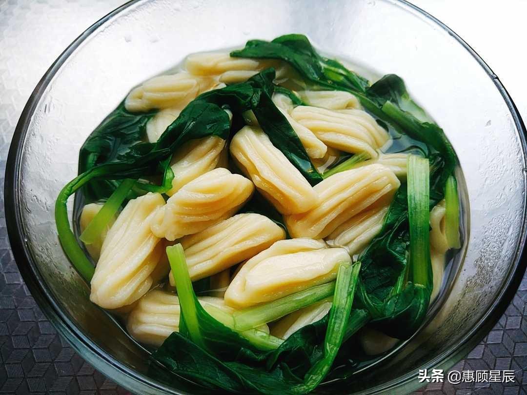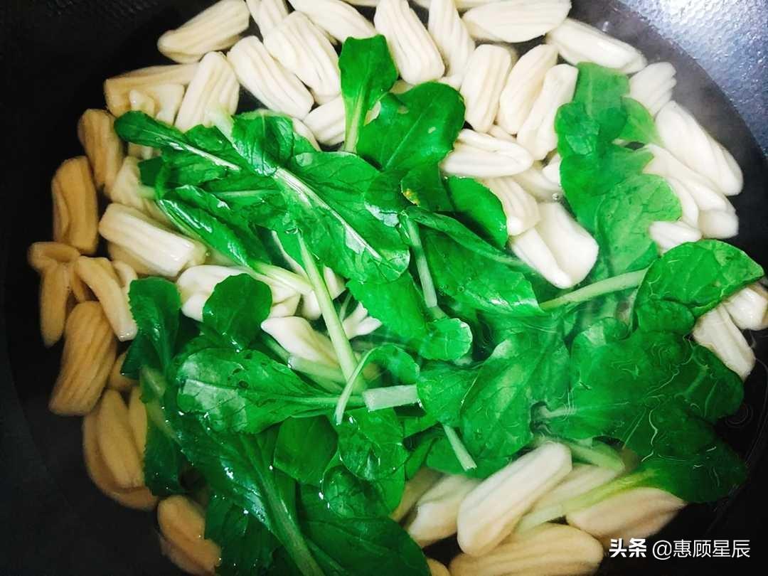 锅里放入适量的清水和盐,大火烧开,下入猫耳朵,煮熟后的猫耳朵全都会漂浮起来,快速下入小青菜,再次煮开就可以了。