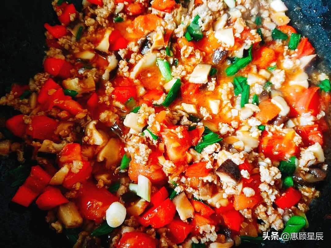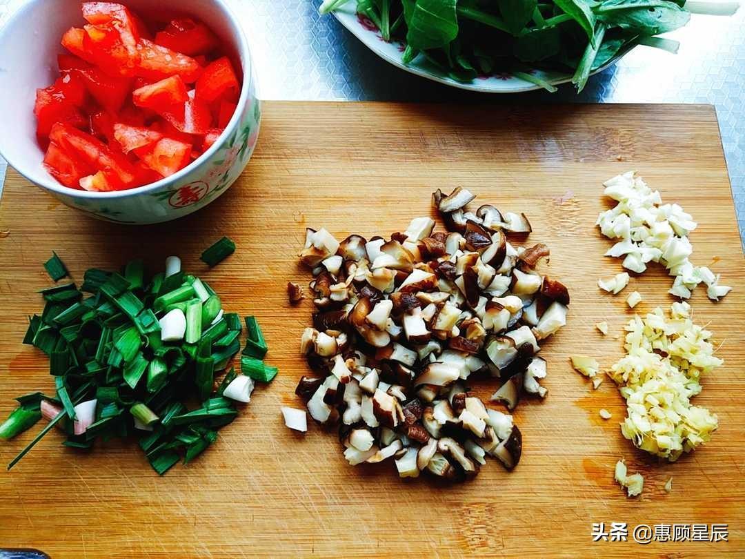 西红柿随便切切碎;香菇切成丁;生姜和大蒜剁碎;青蒜切小丁。全部都处理好后,放一边备用。