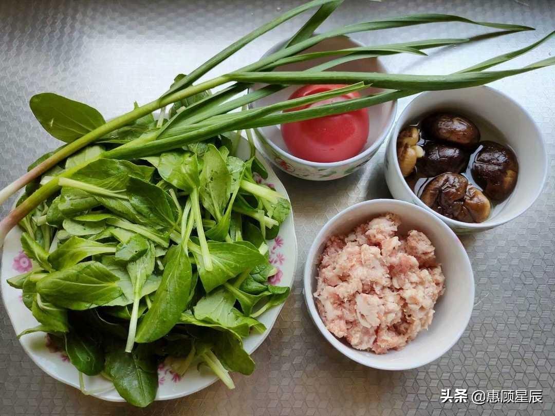趁着醒面的功夫,我们来准备配菜。肉末我是买的现成的加工好的,省得又切又剁太麻烦;西红柿好贵,六块钱一斤,买一个就够了;几朵干的香菇,用温水泡发;一把嫩得出水的小青菜清洗干净。