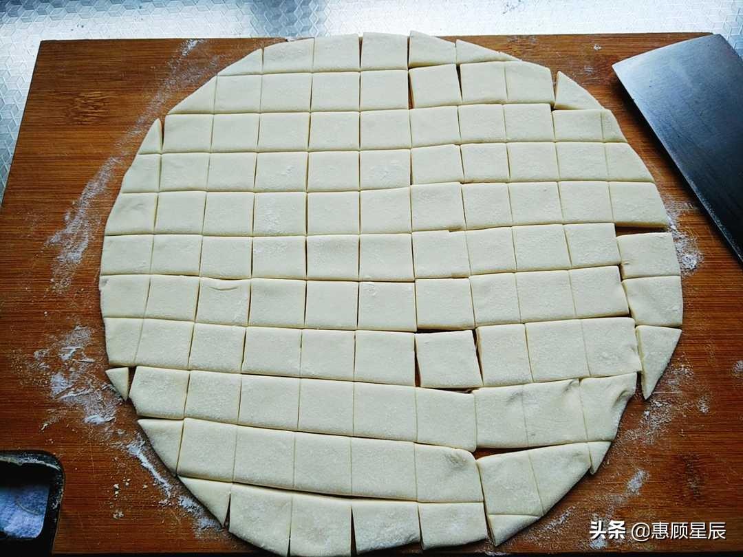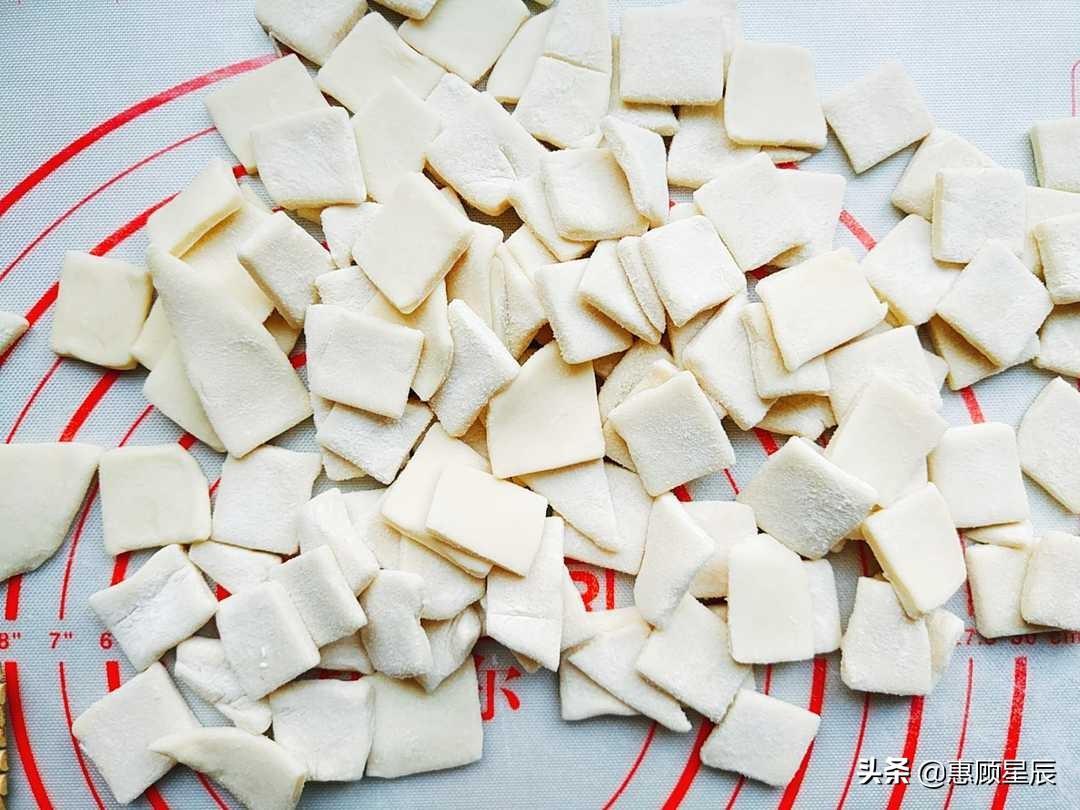 砧板上先撒些干面粉,把醒好的面团拿出来,用擀面杖擀开,擀成厚度大概为0.5cm的薄面片。拿刀在面片上先横切成等宽的长条,再竖着切开。一个个差不多麻将块大小的小方形面块就诞生了。大小也可以自己掌握,跟大拇指的宽度差不多就行。