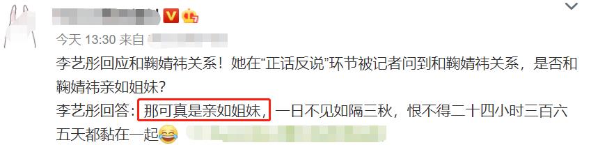 她在与鞠婧祎毫无关系的场合上提到鞠婧祎,《正话反说》环节,她说她俩亲如姐妹,一日不见如隔三秋,恨不得时刻黏在一起,反过来的意思就是十分不熟,平常也根本见不到面。