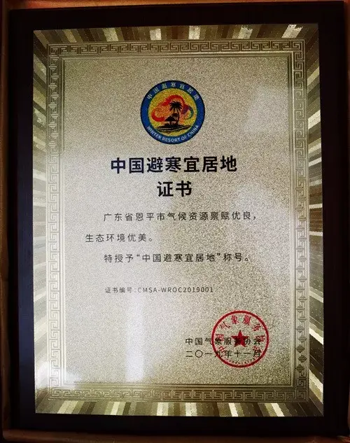 在2019年11月15日,恩平市以优质丰富的避寒宜居资源、良好的生态环境和浓厚的历史文化底蕴,成功获评全国首个“中国避寒宜居地”称号。