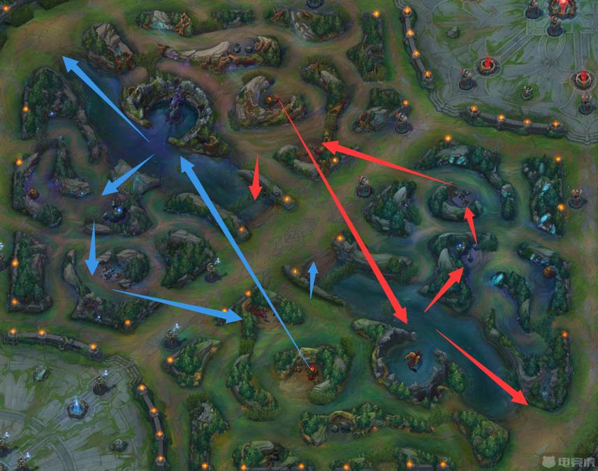 不管是在蓝色方还是红色方,起手打野一定要选择红buff,因为盖伦自身不带控制,先打红buff可以让盖伦在Gank的时候减速敌人。在打完红buff的时候,要去控河道蟹,现在的河道蟹经验值非常的高,打它准没错,如果有机会,在打完河道蟹的时候就可以去上路Gank一波。之后刷蓝buff、三狼、F6这个路线。