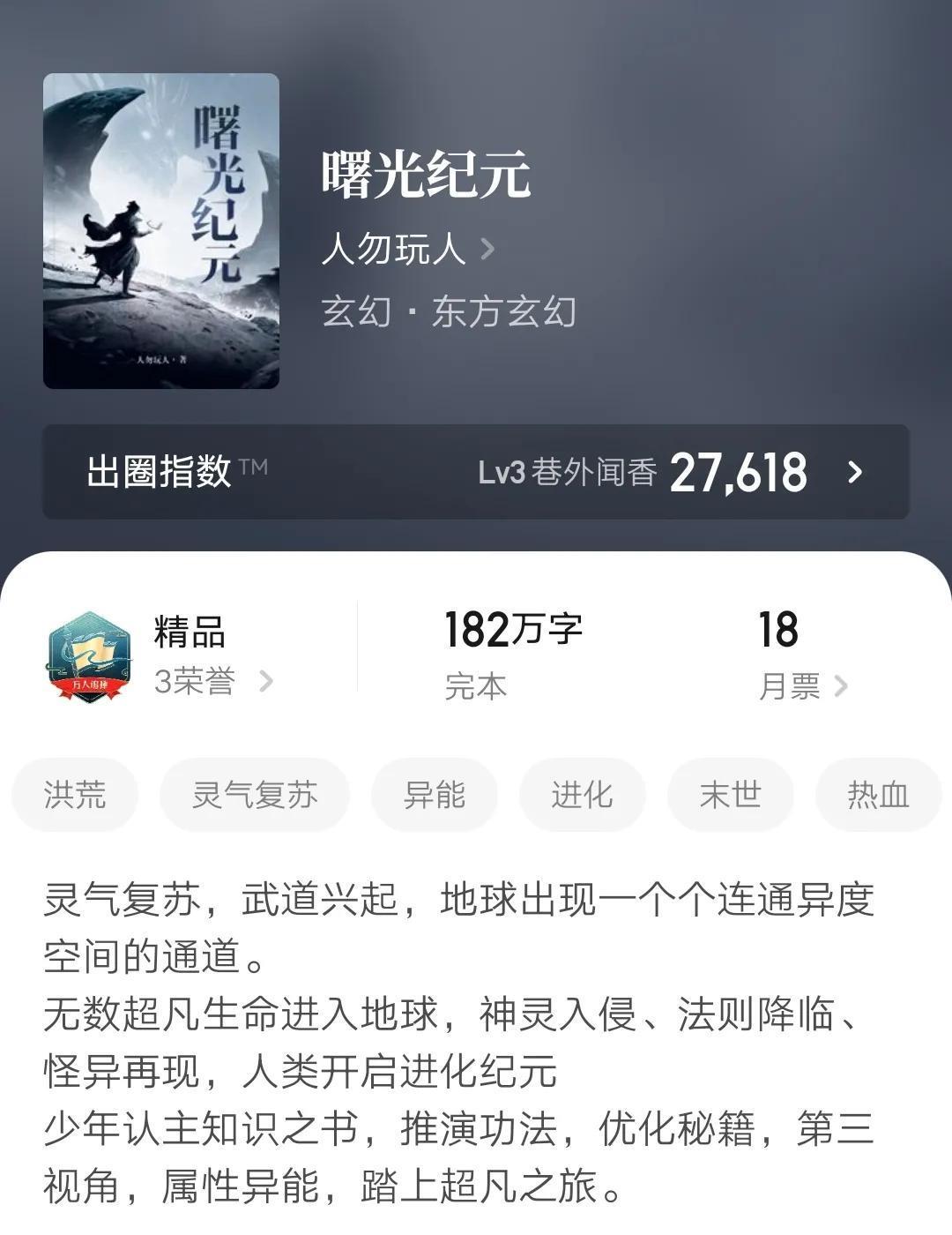 一般写全球大变的书、时间都是往前写的,这本书反其道而行,某个平行次元的2012年,古老预言中的末日降临,连续三天的黑夜笼罩了全世界,三千光柱出现,赵昊无意间撞破血案,被人追杀,不得已之下逃入光柱之中,开启进化之路。