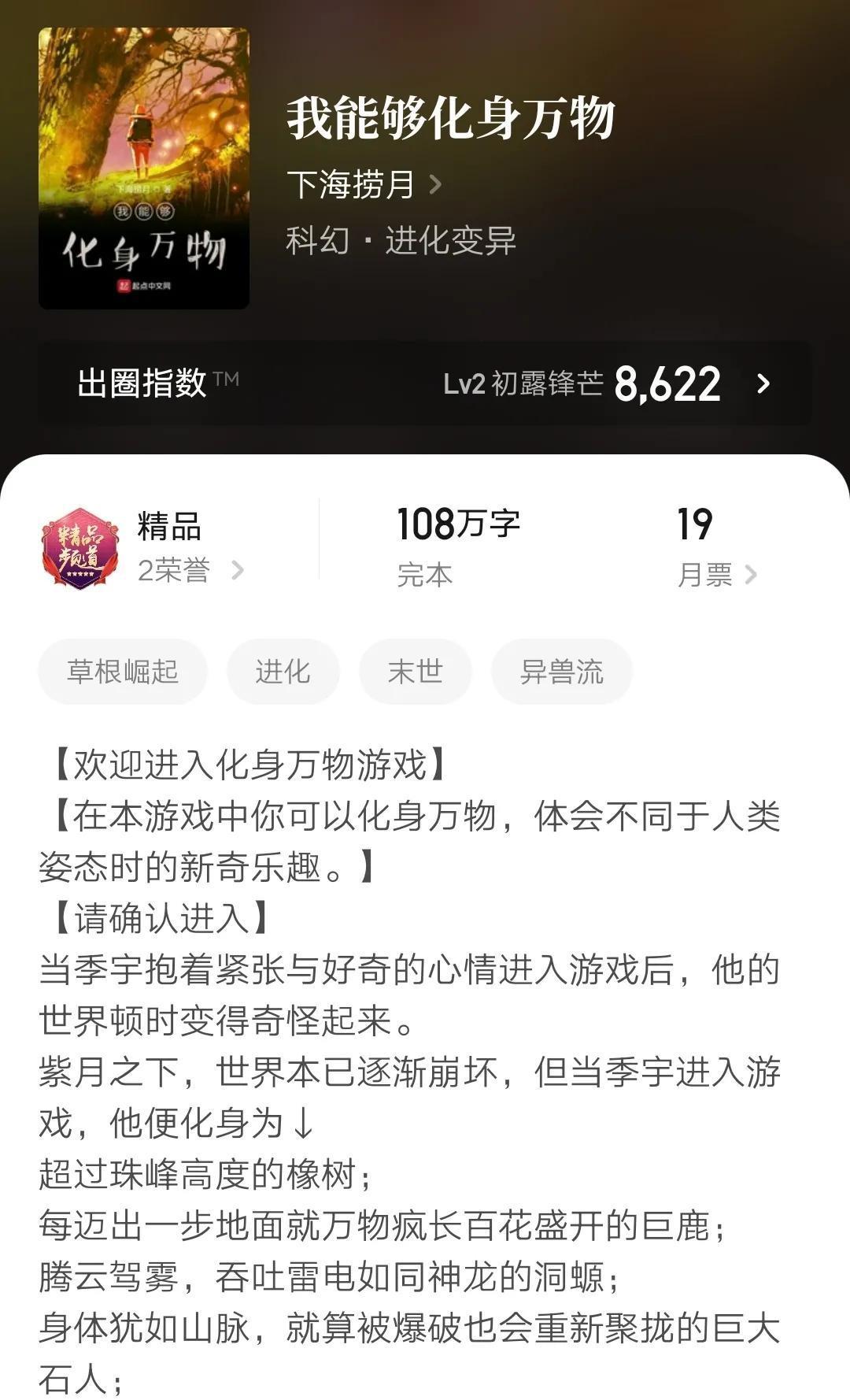 作者下海捞月,科幻分类,108万字,二一年九月完本。